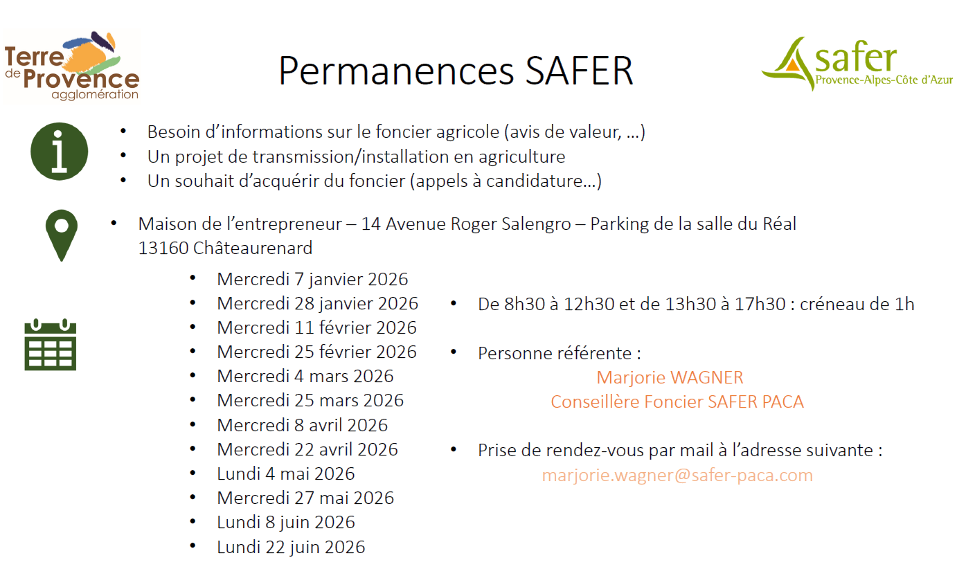 Un besoin d'informations sur le foncier agricole ? Un projet de transmission ou installation sur le territoire ? Un souhait d'acquérir du foncier ? Rendez-vous avec une conseillère agricole de la SAFER à la Maison de l'Entrepreneur de Terre de Provence agglomération.
