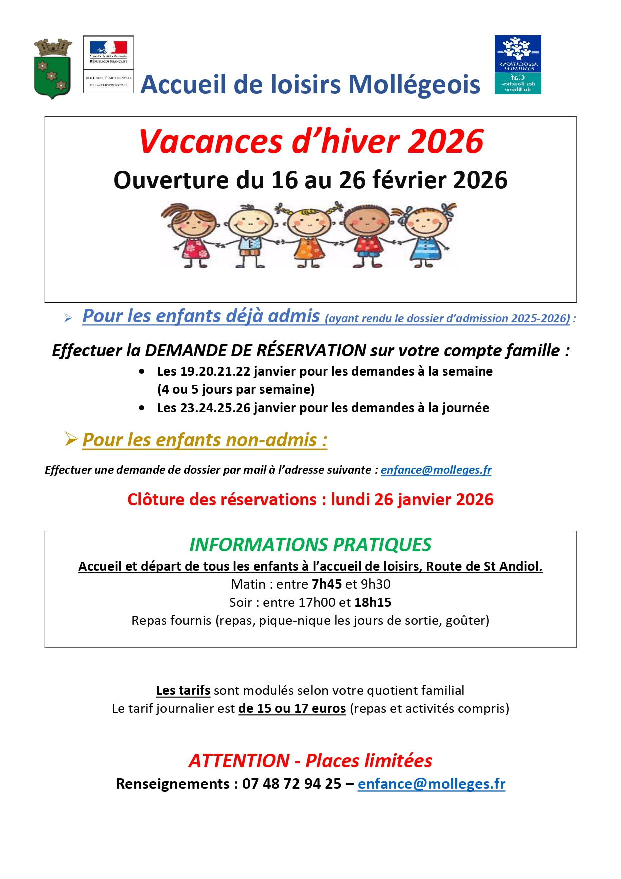 Renseignements : 07 48 72 94 25 – enfance@molleges.fr