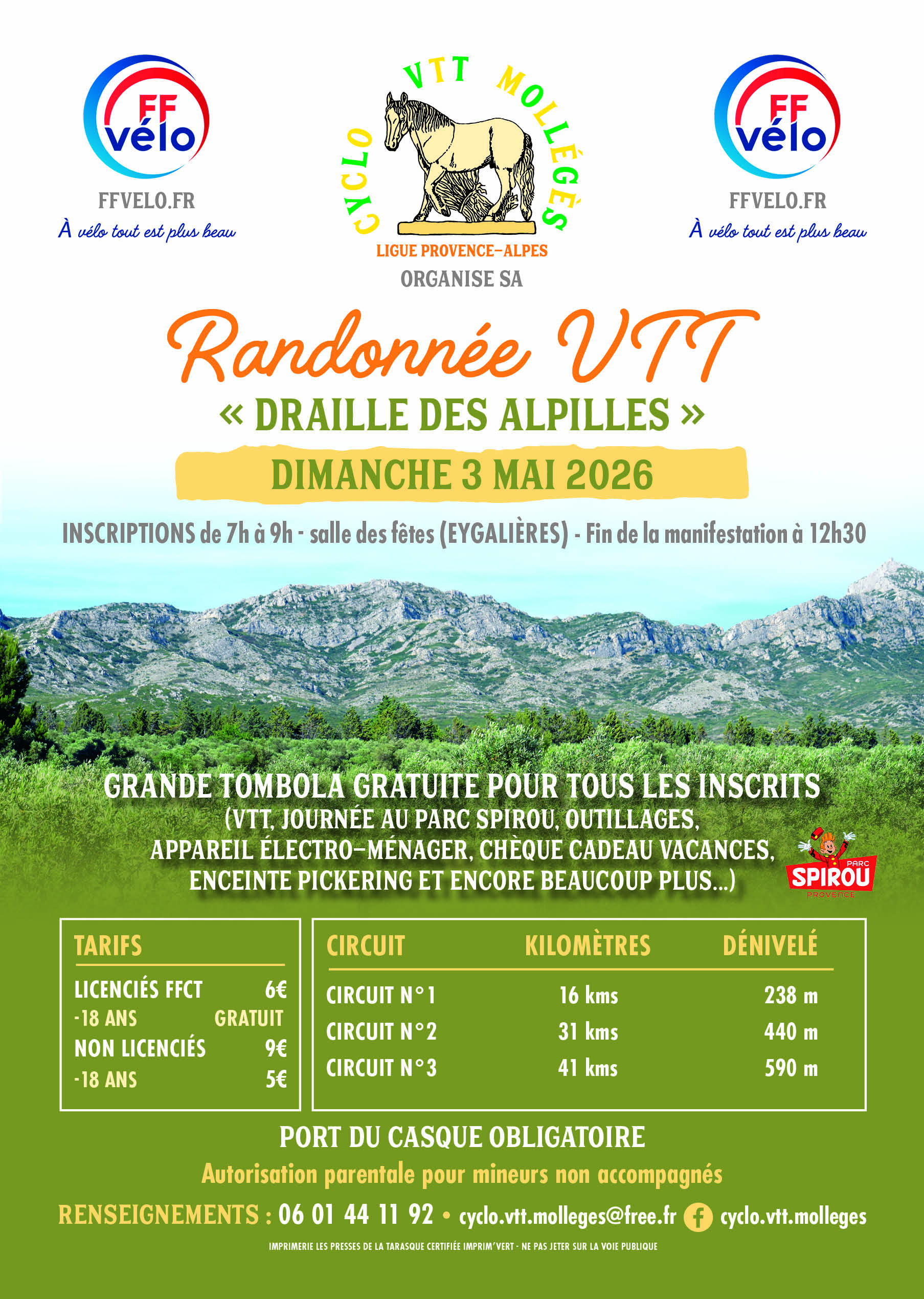 L'association Cyclo VTT Mollégès organise sa traditionnelle rando VTT "Draille des Alpilles" à Eygalières. Trois parcours de 16, 31 et 41 km sont proposés aux amateurs, licenciés ou non. Inscriptions sur place de 7h à 9h. Renseignements : 0601441192 - cyclo.vtt.molleges@free.fr