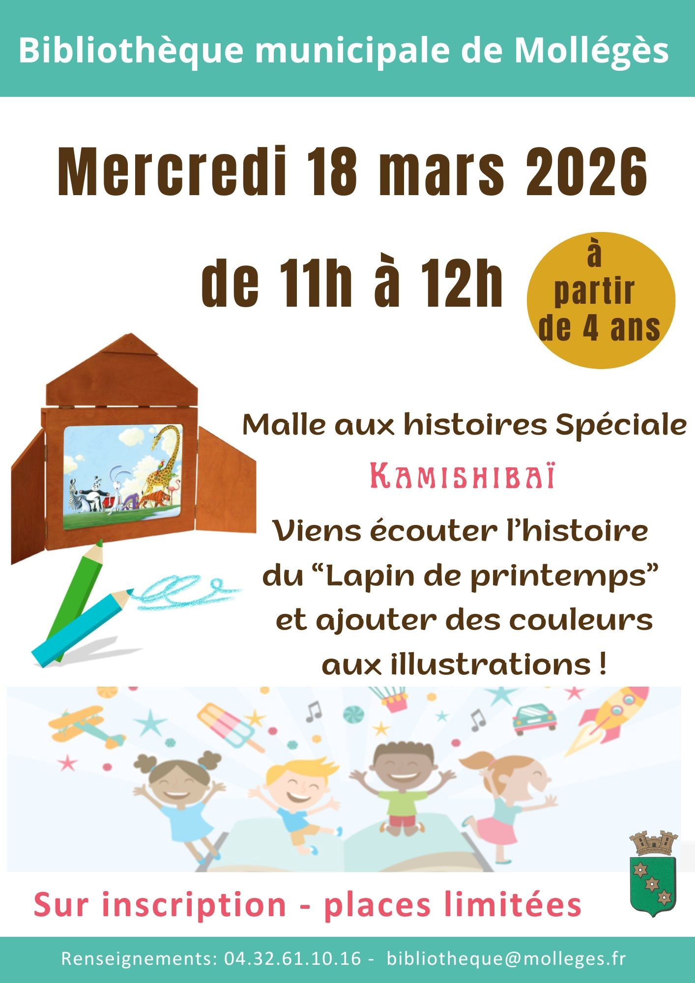 Mercredi 18 mars, de 11h à 12h, viens écouter l'histoire du "Lapin de printemps" et ajouter des couleurs aux illustrations ! À partir de 4 ans. Places limitées. Inscriptions : 04 32 61 10 16 - bibliotheque@molleges.fr