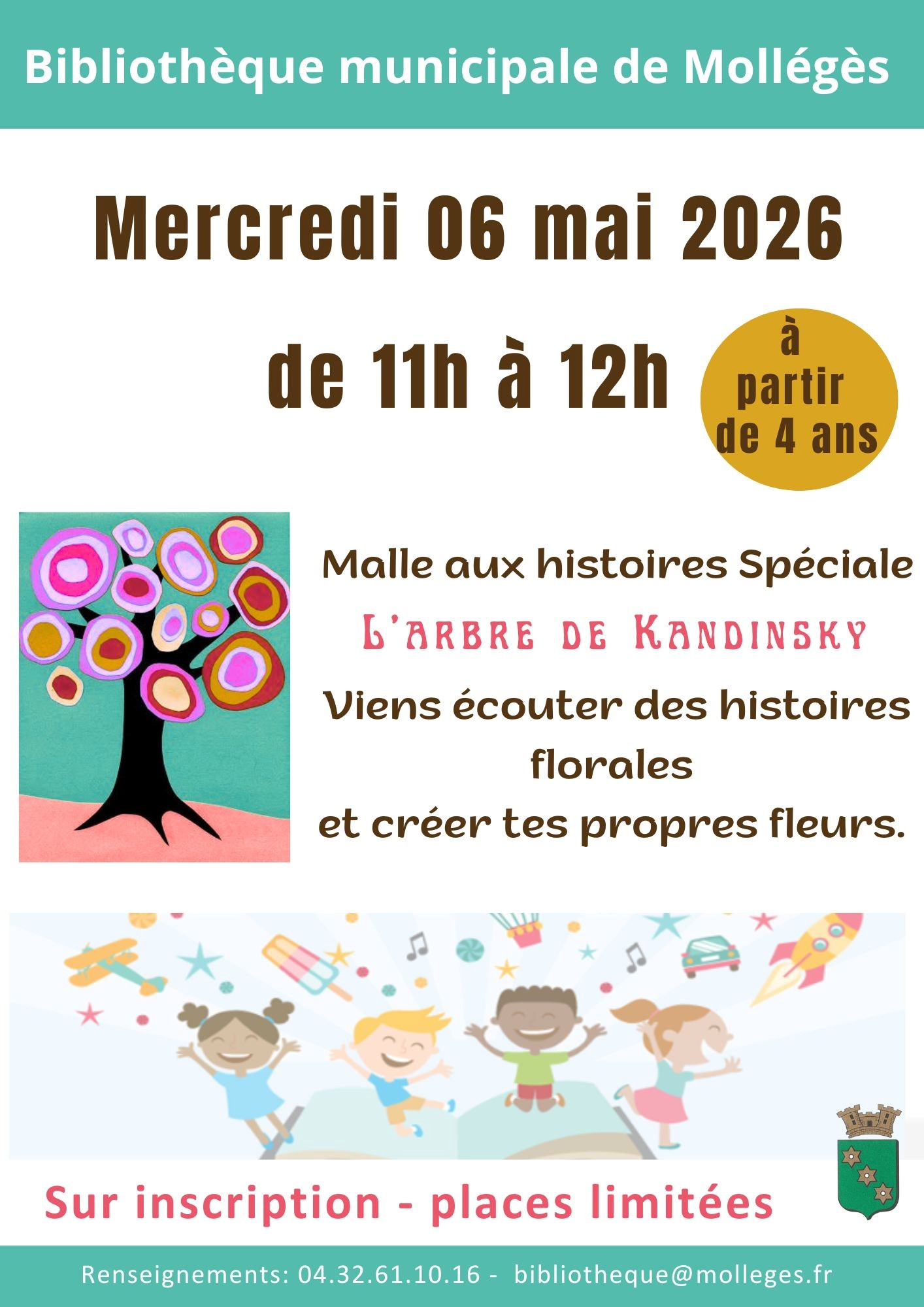 Mercredi 6 mai, de 11h à 12h, rendez-vous à la bibliothèque municipale pour écouter des histoires florales et créer tes propres fleurs. À partir de 4 ans. Places limitées. Inscription indispensable : 04 32 61 10 16 ou bibliotheque@molleges.fr