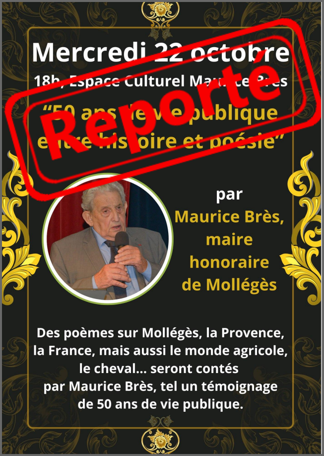 🎤 Mercredi 22 octobre, le maire honoraire de Mollégès, Maurice Brès, propose une soirée poétique et historique, où il contera ses poèmes sur Mollégès, la Provence, la France, mais aussi le monde agricole, le cheval... Il y révélera les raisons qui l'ont poussé à prendre la plume et, aujourd'hui, la parole, retraçant ainsi 50 ans de vie publique.