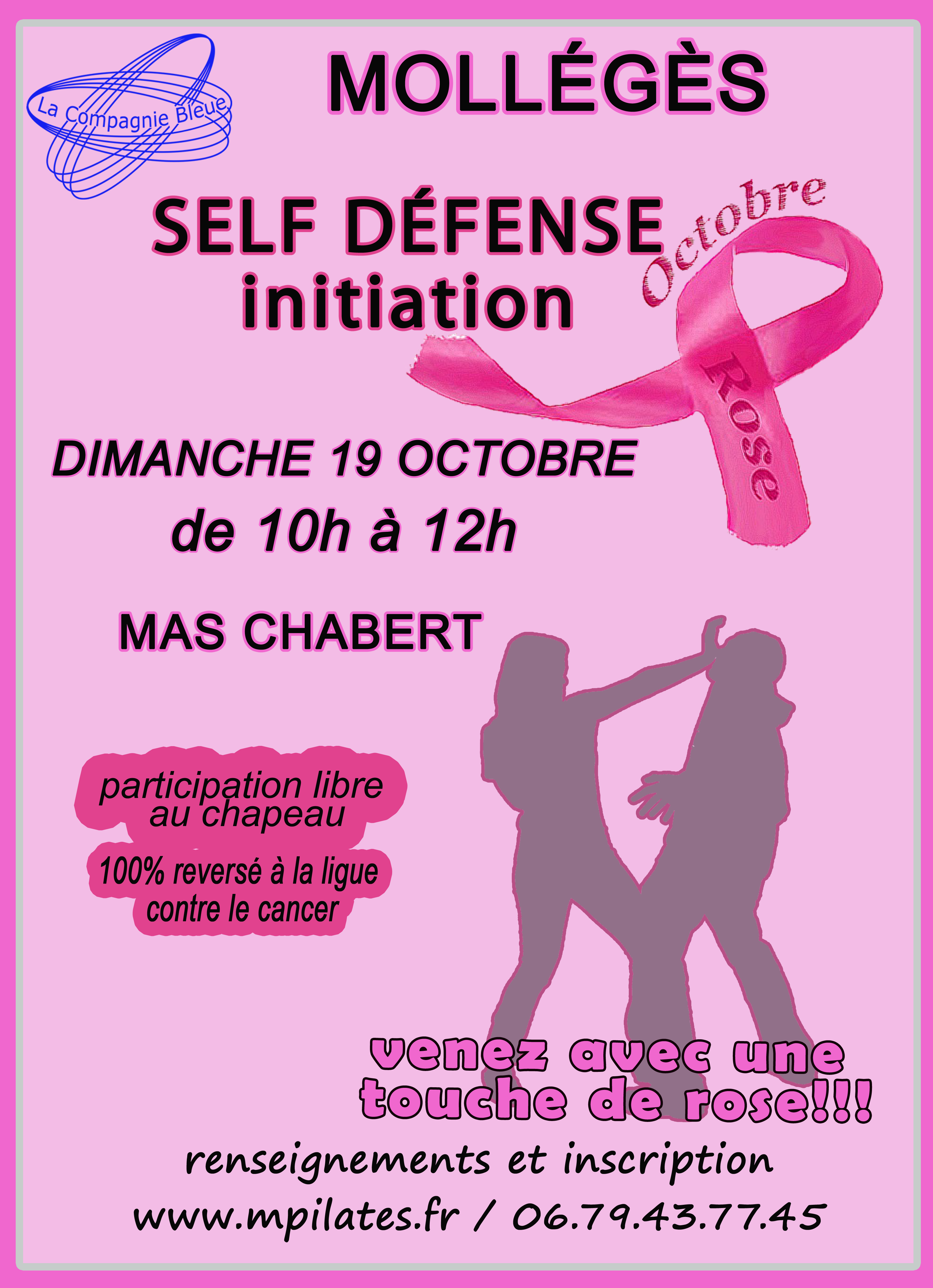Dans le cadre d'Octobre rose, l'association La Compagnie Bleue propose une initiation au self-defense le dimanche 19 octobre, de 10h à 12h au Mas Chabert. Tous les bénéfices seront reversés à la Ligue contre le cancer (participation libre au chapeau). Renseignements et inscriptions : 06 79 43 77 45