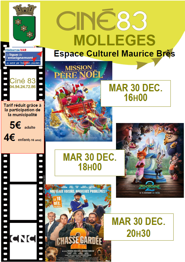 🎬 Mardi 30 décembre, la municipalité de Mollégès propose une triple séance "ciné" à l'Espace Culturel Maurice Brès :