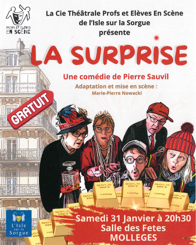 La compagnie théâtrale "Profs et Elèves en Scène de L'Isle sur la Sorgue", qui nous avait régalés l'an dernier avec "Du pastaga dans le champagne", revient avec une nouvelle pièce "La surprise". À découvrir sans modération !