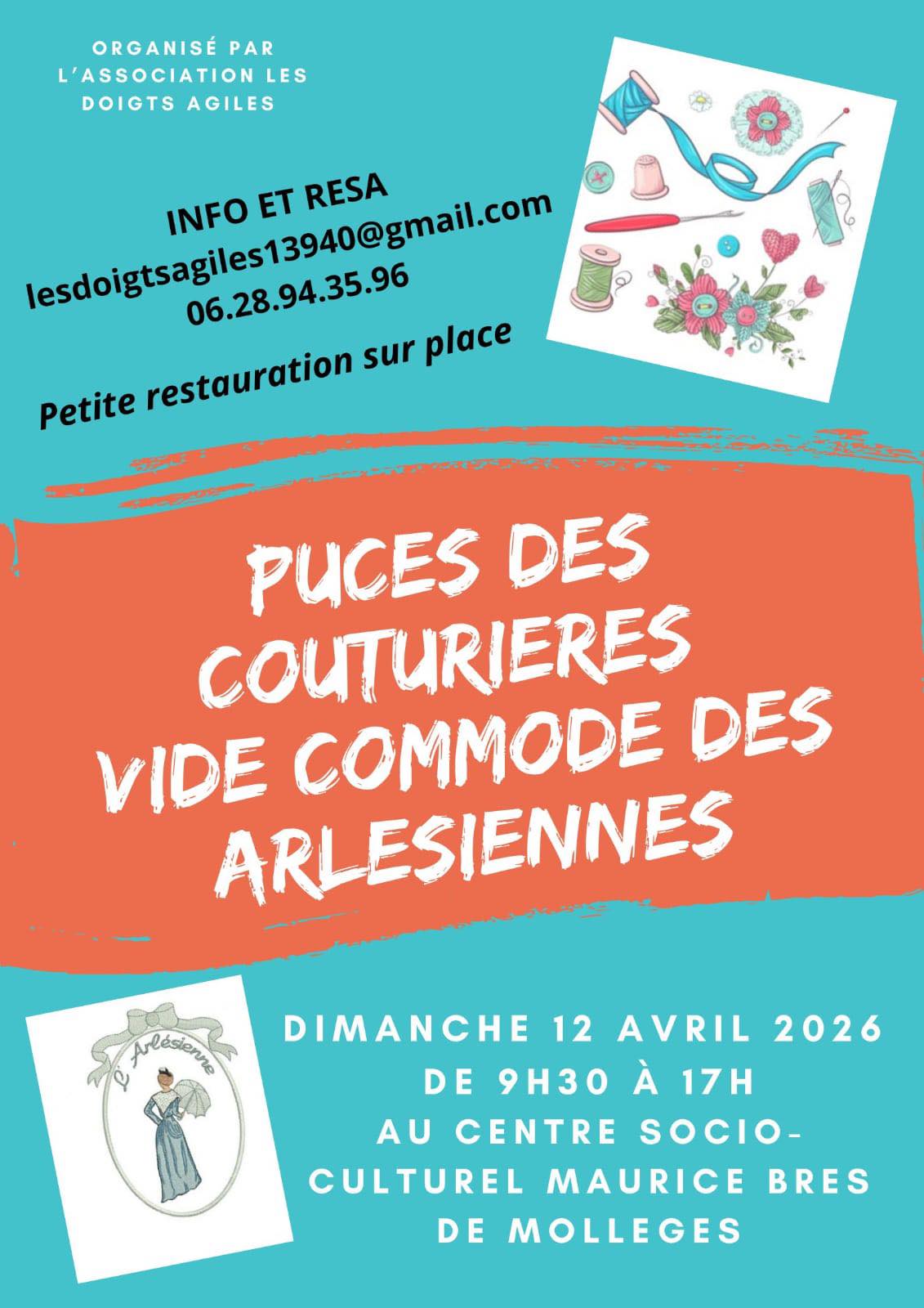 Dimanche 12 avril, l'association Les Doigts Agiles renouvelle sa manifestation "Puces des couturières et vide commode des Arlésiennes", de 9h30 à 17h à l'Espace Culturel Maurice Brès. Petite restauration sur place. Réservations : 06 28 94 35 96 - lesdoigtsagiles13940@gmail.com